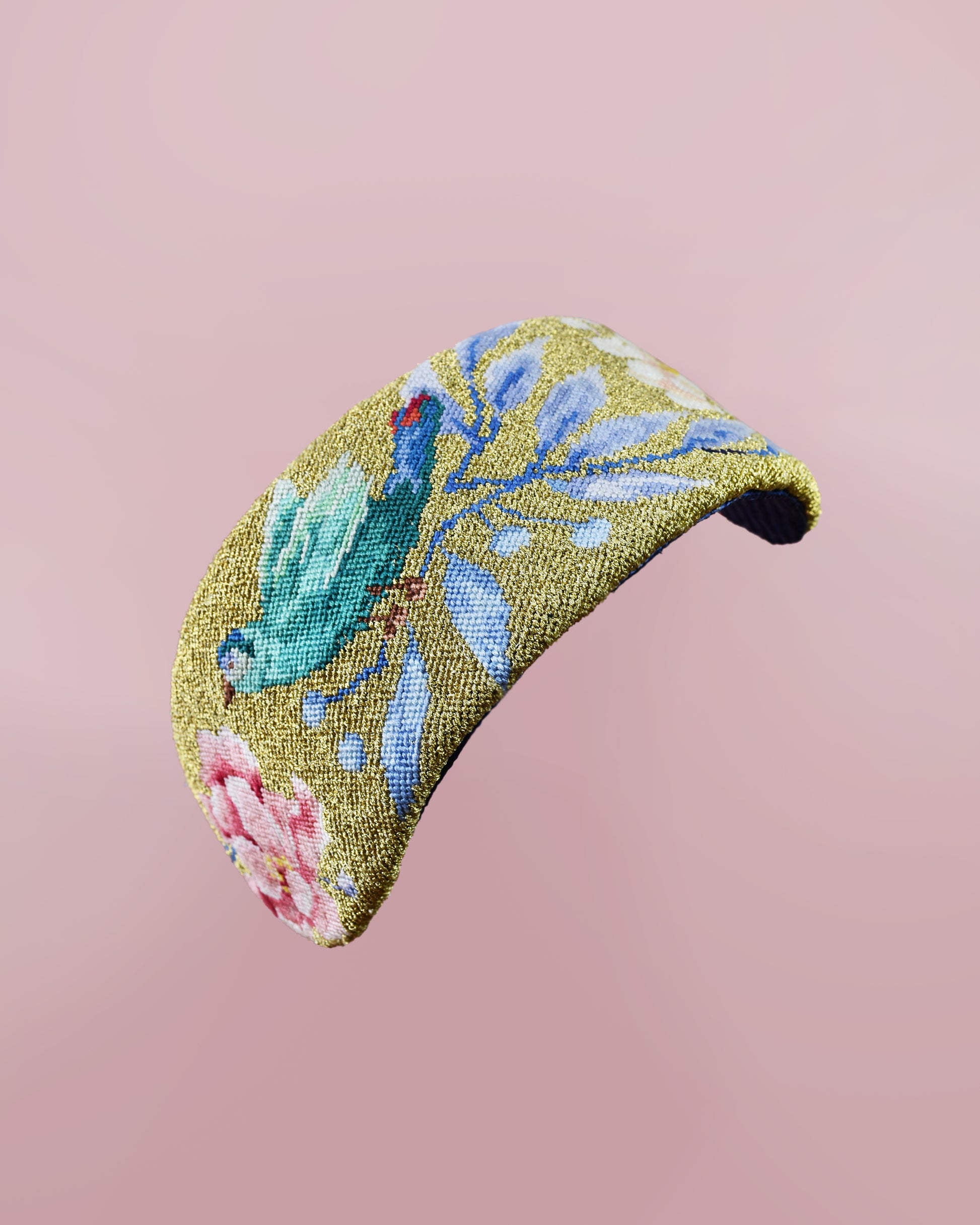 - Hand-embroidered headpiece (in needlepoint technique) with 100% Cotton and Gold Threads
